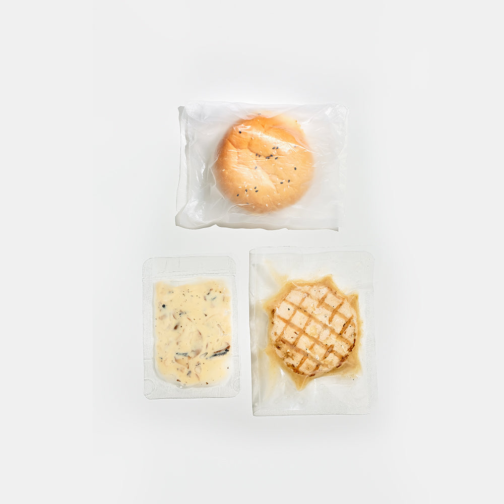 INGREDIENTS: Yellowfin tuna patty, cheddar cheese, Japanese melty cheese, portobello mushrooms, caramelised onions, garlic, butter, salt, pepper.
